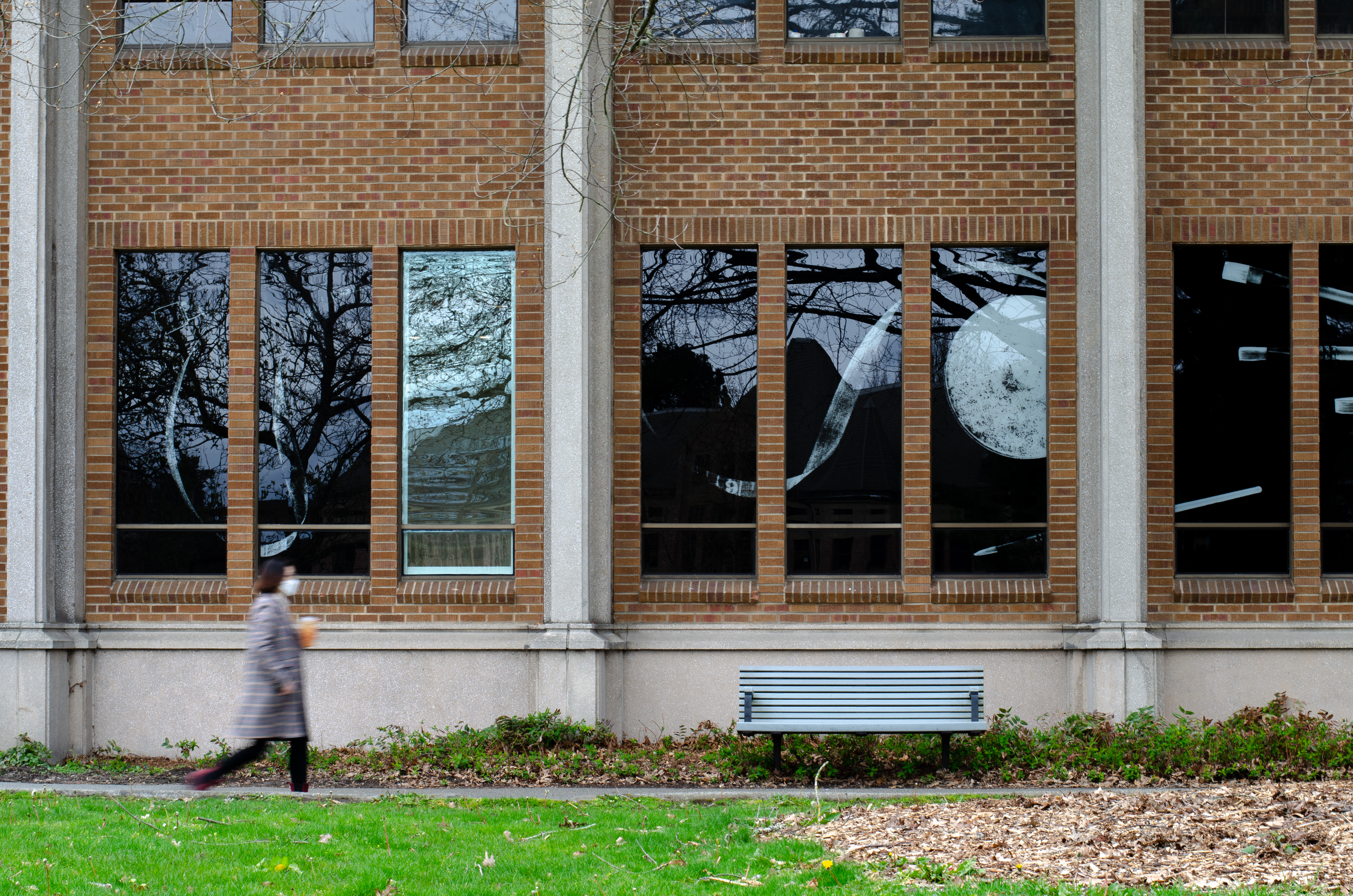 In 2023, an entirely new and expanded Jacob Lawrence Gallery (”the Jake”) opened as part of a significant renovation of the UW School of Art+Art History+Design building. In addition to the installation of monolith navigational signage, an opportunity arose to incorporate graphics into the exterior facade of the gallery windows, increasing the visibility of the the Jake to the wider campus. The final window graphics combine treated photographs of Jacob Lawrence’s personal tools with that of tools currently found in workshops and classrooms in the building. These objects appear at larger-than life scale, demanding the attention of passerby and immortalizing Jacob Lawrence’s legacy. The tool visuals act as a sort of equalizer; former, current, and future students and faculty are brought together by the universal tools through which they create.