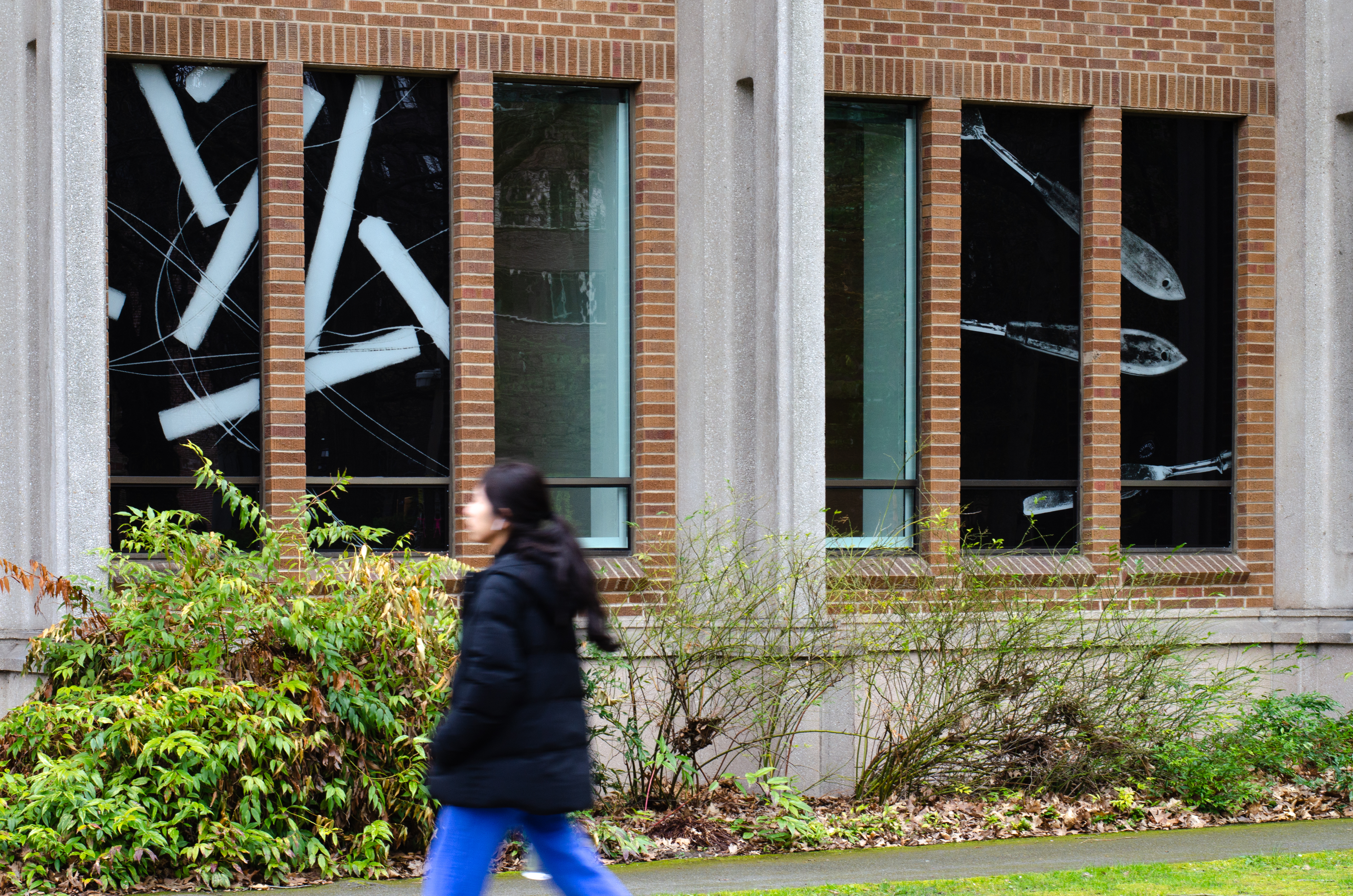 In 2023, an entirely new and expanded Jacob Lawrence Gallery (The Jake) opened as part of a significant renovation of the University of Washington School of Art+Art History+Design building. In addition to the installation of monolith navigational signage, an opportunity arose to incorporate graphics into the exterior facade of the gallery windows, increasing the visibility of the the to the wider campus.