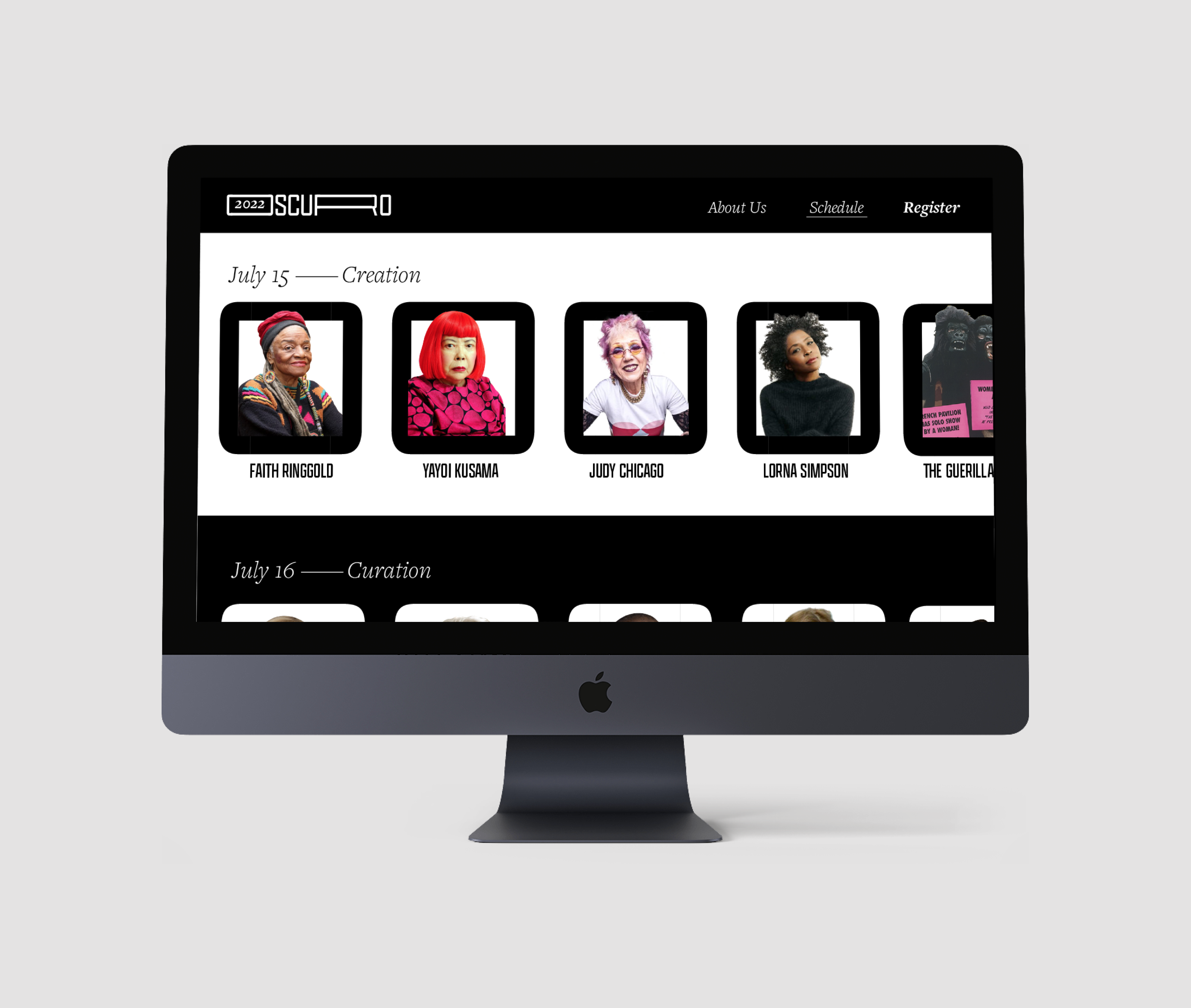 The identity for the conference hinges on a variable, typographic logo which acts as a framing device for the featured artworks. These works, all made by women, provide the sole source of color in the visual brand. Through overlays and bleeds, the art breaks free from the constraints of the conventional frame, or rather, male-centric narratives of art history.